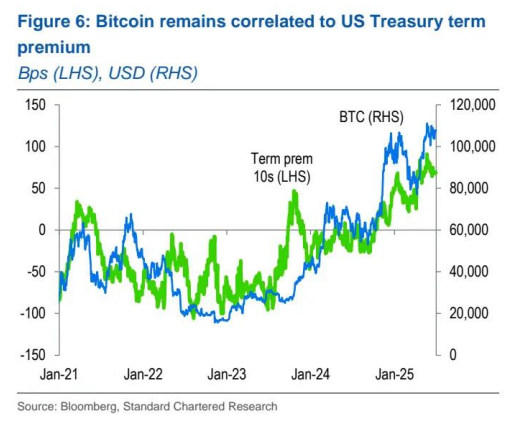 渣打认为,美国的政策和监管发展也可能在第三季度推动比特币价格上涨。特朗普总统最近表示,他将提前(在 10 月,即鲍威尔当前任期于 5 月到期之前)任命美联储主席鲍威尔的替代者,这就是其中一个驱动因素。这可能会导致市场提前消化更多的美联储降息,也会增加投资者对美联储独立性的担忧 —— 这两者都对期限溢价有利。