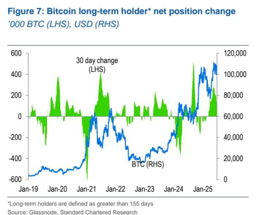 渣打将关注长期持有者的抛售情况(或不抛售情况),以判断是否会出现这种情况。2021 年初比特币达到当时的历史新高后,长期持有者在一个月内抛售了 600,000 枚比特币。相比之下,当前周期中最大的抛售期是 2024 年 3 月至 4 月(400,000 枚比特币)和 2024 年 12 月 / 2025 年 1 月(200,000 枚比特币);见图 7。