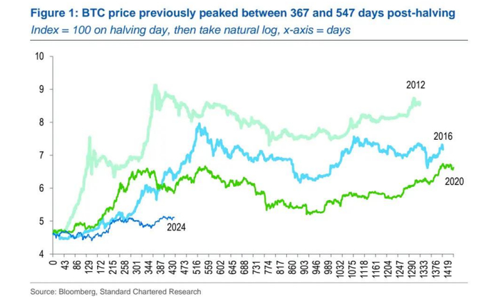 图 1:比特币价格此前在减半后 367 至 547 天之间达到峰值