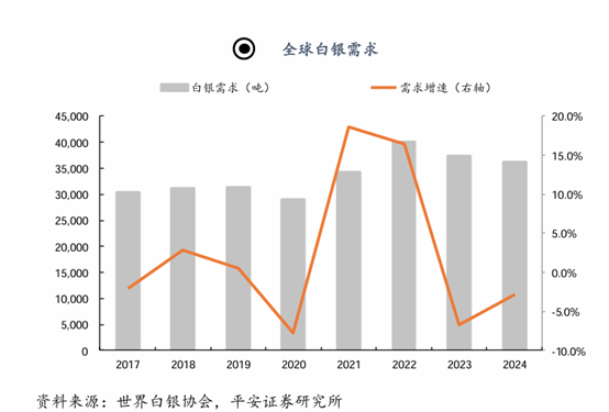 而从需求角度来看,全球白银需求已经进入结构性扩张阶段。全球白银需求2020年后呈现中枢性抬升,2021年以来整体需求规模维持在3.4万吨以上,趋势上来看,近年来白银需求规模呈现边际下降,2024年全球白银总需求同比下降2.9%至3.62万吨,主要受白银实物投资需求规模下降拖累。