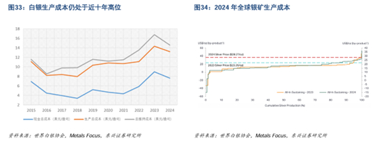 作为白银的常见伴生金属,铜、黄金、铅、锌的现货价格2024年内分别增长7%、28%、7%和20%,因此2024年白银生产成本呈现下滑,但仍处于近十年中的高位。
