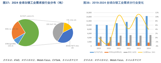 电子电气白银需求是工业用银主体。根据世界白银协会的统计口径,白银工业需求主要分为三大类,即电子电气、钎焊合金和焊料及其他工业。其中,电子电气白银需求占比最大,2024年该行业白银需求量为14323吨,占工业白银需求比例达67.7%。
