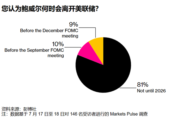 近期特朗普及其盟友对鲍威尔的攻击明显加剧,以美联储总部翻修成本超支为由,持续施压要求其辞职。鲍威尔则回应称,若非特朗普的贸易政策增加经济不确定性,美联储本可在今年更早启动降息。尽管多数华尔街人士认为,特朗普“因故解雇”鲍威尔面临法律障碍(博彩市场Polymarket显示其2025年离职概率仅22%,较上周18%小幅上升),但调查显示,多数受访者仍预期鲍威尔将完成任期至明年5月。