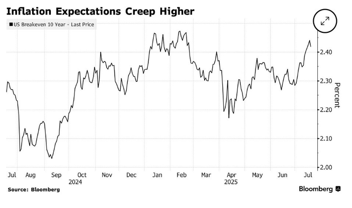 不过,美国银行利率策略师梅根·斯威伯认为,“陡化交易”对冲效果可能受限,因财政部或通过控制长期债券发行量来抑制收益率上行(7月30日将公布下一季度再融资计划)。她更推荐“盈亏平衡利率”策略(即普通国债与通胀保值债券收益率之差),认为这是“更干净”的对冲工具,可有效捕捉鸽派美联储政策推高通胀的潜在风险。目前,反映市场通胀预期的10年期盈亏平衡利率已升至2.42%,接近2月以来最高水平,显示投资者正为美联储独立性风险定价。