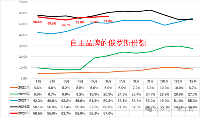 崔东树表示,中国车企在2021年初在俄罗斯市场已经逐步崛起的状态,但份额在5%左右;2023年中国车企抓住了俄罗斯国内市场需求相对旺盛,而供给不足的特征,实现了突破50%的份额;2024年自主品牌在俄罗斯6-9月的月度份额又突破了60%的份额,实现了中国车企强势增长的表现,但2024年在4季度的自主份额持续下行;2025年1-6月微降到55%,6月自主车企在俄罗斯份额回升到57%。