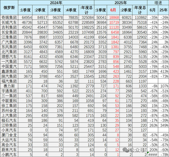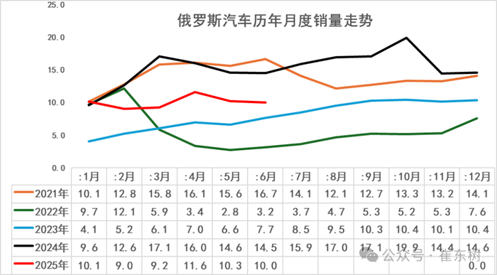 乘联分会秘书长崔东树称,随着中国汽车的保障供给,2024年的俄罗斯汽车总体销量达到183万辆,同比增长91%,创出近期销量年度新高。2025年6月俄罗斯汽车销量达到10万辆的水平,同比下降31%,环比5月降2%。1-6月俄罗斯车市的累计销量60万辆,同比下降29%。