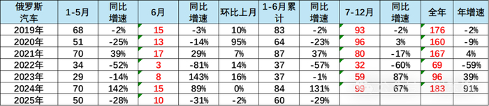 随着中国汽车的保障供给,2024年的俄罗斯汽车总体销量达到183万辆,同比增长91%,创出近期销量年度新高。2025年6月俄罗斯汽车销量达到10万辆的水平,同比下降31%,环比5月降2%。1-6月俄罗斯车市的累计销量60万辆,同比下降29%。
