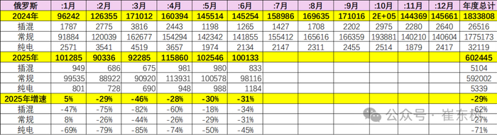 俄罗斯车市的新能源销量相对较低,由于欧美日韩车企的新能源比较差,因此2023年前的俄罗斯新能源很少。但随着中国车企的进入,新能源成为俄罗斯富豪的偏爱,纯电动表现优秀,随后理想等车型的俄罗斯销量较好,带来2024年插混的销量高于纯电动的俄罗斯特色。2025年的俄罗斯市场回落,新能源车的回落幅度更明显,插混下降62%,纯电动下滑71%,燃油车仅下滑27%