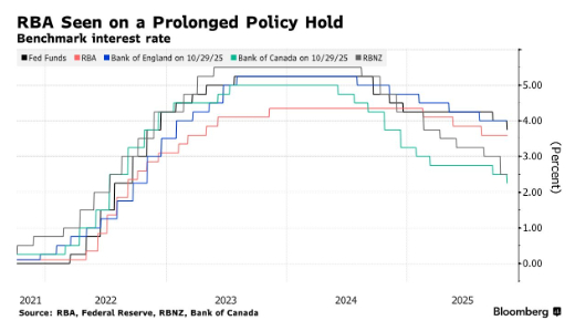 一项调查显示,在消费者物价超预期上涨后,经济学家一致预计澳洲联储将在11月3日至4日的会议上,把现金利率维持在3.6%。隔夜指数掉期市场同样显示,按兵不动几乎已成定局,市场目前仅预计到2026年中期才有较大可能降息。