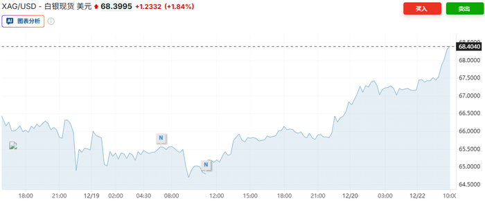 受地缘政治紧张局势加剧以及市场预期美联储明年将进一步降息的影响,白银价格继续创下历史新高,黄金价格也随之走高。周一,截至发稿,现货白银价格上涨1.84%,至68.3995美元/盎司。现货黄金价格上涨至接近4383美元/盎司,突破10月份创下的4381美元以上的历史高位,此前两周价格持续走高。