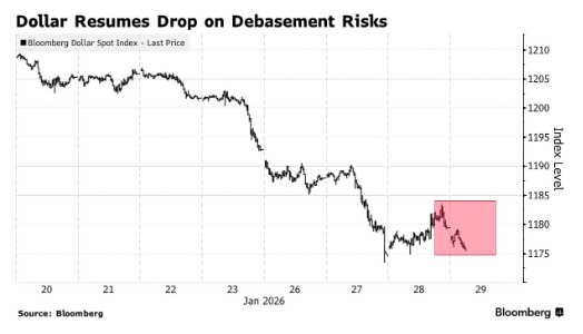 由于市场对所谓的“货币贬值交易”(debasement trade)忧虑重燃,其影响盖过了美国财政部长贝森特对强势美元政策的重申利好,美元汇率再度下跌,周三反弹行情戛然而止。