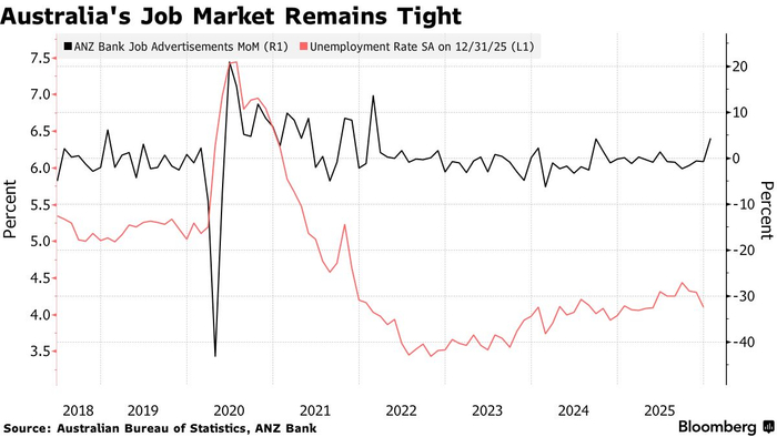 澳洲联储实行“双重使命”,即力求将通胀维持在目标区间2%—3%的中值2.5%,同时努力使经济保持在最大可持续就业水平。上周公布的一份报告显示,备受关注的“修剪均值”通胀指标(剔除波动性项目)在去年第四季度同比上升3.4%,增幅高于市场预期。该数据发布前几天,失业率在12月份意外回落至4.1%。这两项结果均表明,价格压力仍然是澳大利亚经济的一个显著特征。