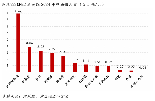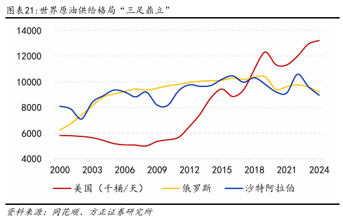 当前,世界原油供给格局呈“三足鼎立”之势。美国是全球最大的原油生产国,依靠页岩油技术,在2024年,年产量接近13200千桶/天。俄罗斯原油产量虽受地缘政治因素影响,但依旧对全球市场产生重要影响。沙特阿拉伯作为OPEC的核心成员,凭借低成本产油能力,对全球油价具有决定性影响。三大产油国的产量和产量调整策略直接影响全球石油市场的供需平衡和价格波动。
