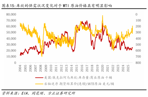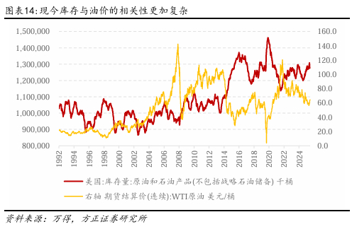 商业库存作为“价格晴雨表”,会对油价的波动产生较大影响,且不同阶段变动关系不同。2003年成为美国原油储备与市场供需关系的分界点。