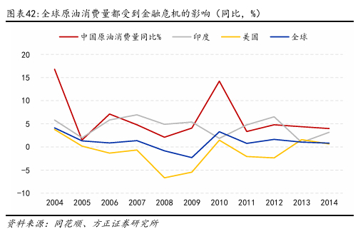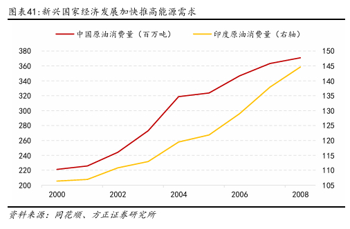 2000年1月~2008年7月,原油价格长期上涨,经历了一个近乎持续的牛市。其中2001年12月的Brent价格成为此阶段油价最低点主要原因在于911恐怖袭击造成了全球金融市场的极度恐慌,这是自冷战后美国首次面临重大安全威胁。在此阶段全球经济进入高速发展期,尤其是中国、印度等新兴市场国家的快速工业化和城市化进程显著推高了能源需求。另一方面,2003年伊拉克战争、尼日利亚和委内瑞拉等主要产油国产量受限,地缘政治风险加剧原油市场对供应安全的担忧,推动油价持续攀升。投机资金也大量涌入石油期货市场,金融属性进一步放大了涨幅。直到2008年7月,油价创出历史新高,Brent突破133美元/桶。