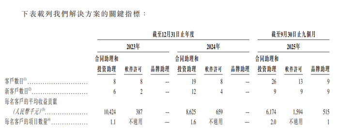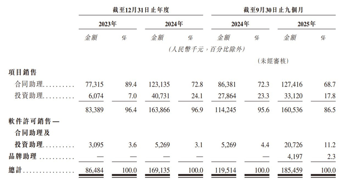 从收入端看,合同助理为核心收入来源,2023年至2025年前9个月,该业务收入贡献分别为89.4%、72.8%及68.3%,收入份额虽呈现下降趋势,但收入仍保持增长;投资助理业务为第二大业务,2024年开始放量,2025年收入放缓,前9月收入份额17.8%,不过软件许可销售的投资助理业务增长高达2.9倍,使得收入份额从4.4%增至11.2%;品牌助理业务2025年才产生收入,收入份额不足3%。
