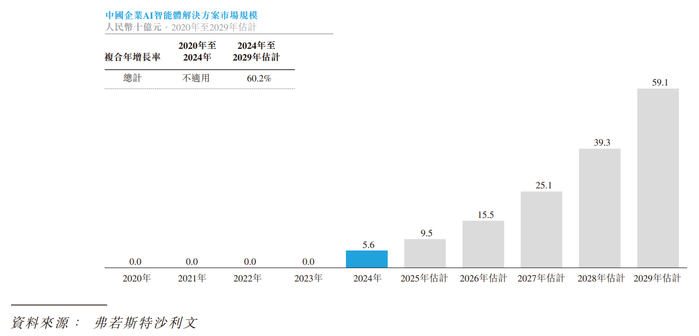 根据弗若斯特沙利文,中国企业级AI智能体解决方案于2024年起步,市场规模为56亿元,预计到2029年将达到591亿元,五年增长超10倍,复合增速达60.2%。