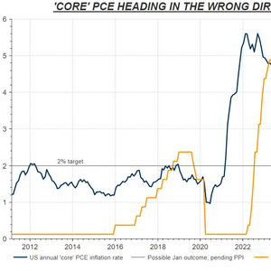 尽管1月消费者价格指数(CPI)的总体数据表现疲软,最初在债券市场掀起了一波热炒浪潮,但美联储实际密切关注的通胀指标——即剔除食品与能源价格影响后的个人消费支出(PCE)通胀篮子中的“核心”指标——却一直在朝着不利的方向变动。