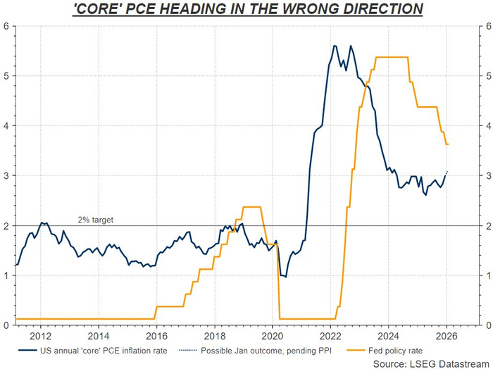 在四季度GDP数据意外逊于预期,以及上周五关税政策引发的混乱局面稍作“掩盖”的背景下,12月核心个人消费支出(PCE)价格指数显示,通胀率近两年来首次再度攀升至3.0%——这一数据不仅高于市场预期,而且较美联储设定的目标整整高出了1个百分点。
