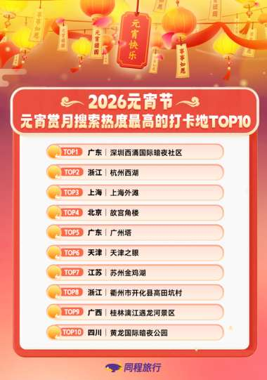 同程旅行数据显示,截至3月2日16点,元宵赏月搜索热度最高的十大热门打卡地中,不仅包括杭州西湖、上海外滩、北京故宫角楼、天津之眼、广州塔、苏州金鸡湖、桂林漓江遇龙河景区等知名景点,深圳西涌国际暗夜社区、四川黄龙国际暗夜公园、浙江衢州市开化县高田坑村等热门观星旅游目的地,搜索热度同样旺盛。其中,深圳西涌国际暗夜社区搜索热度较上周同期增长超 110%,领跑国内赏月打卡地热度榜单。