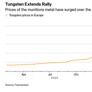 尽管具有战略重要性,但从实际规模与交易透明度来看,钨仍然是一个相对小众的金属交易市场。Project Blue估计,今年钨市场规模约为160亿美元——按当前价格计算,约仅仅相当于铜市场的5%。它的市场与贸易模式也远比铜更加不透明、流动性更差,因为它并不在LME这类主要金属交易所交易。即便如此,过去一年钨的涨幅仍远远超过黄金和石油等大宗商品。