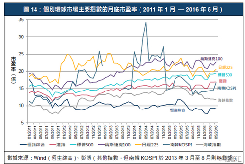 图 14 比较香港市场与美国及亚洲主要指数的市盈率;有关的美国指数为道琼斯工业平均指数(道指)、标准普尔500 指数和纳斯达克100 指数,有关的亚洲指数为日本的日经225 指数、南韩KOSPI 指数和新加坡的海峡时报指数(海峡指数)。日本市场市盈率常态水平与美国市场相若,新加坡市场的市盈率常态水平则处于美国市场与香港市场之间。