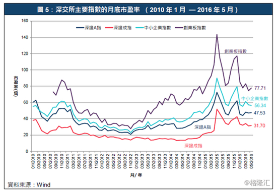上图 5 清楚显示深交所不同市场类别市盈率的显著差异。在其创业板上市的增长型小企业的市盈率最高,深证成份指数所代表的大型股的市盈率最低。