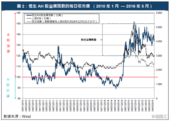 排除不同股票组合的因素,在同时有H 股于香港上市及有A 股于内地(上海或深圳)上市的公司之中,A 股与相应H 股之间的溢价/折让更能有效反映股票估值的差异。恒生AH 股溢价指数正是用于追踪这估值差异趋势,如下文图2 所显示:A 股大部分时候的买卖价均高于相应的H 股,由2015 年开始溢价更持续高于过去水平。事实上这走势与上证A 股指数在该段期间的上升轨道一致,只是香港市场并无紧随。