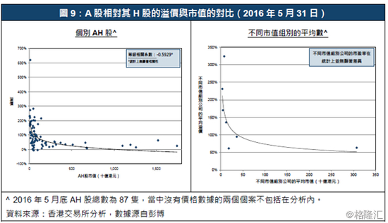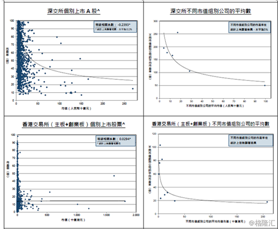不过,香港与内地市场宏观层面的股价差异在微观层面上未必如此。深入分析显示,内地市场上市公司规模愈大,市盈率倾向愈低,但在香港市场,不同股票有不同市盈率,市盈率与上市公司规模之间并无显著关系。虽则行业未必是决定市盈率的关键因素,若干行业的股票出于行业性质的关系,其市盈率往往比同一市场其他股票较高或较低。特别是传统金融业的市盈率倾向较低,而新经济行业如科技及医疗保健等则倾向较高。若干行业的公司在香港作首次公开招股,估值亦可能较在内地为高。