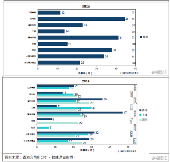 上海市场:金融股较资讯科技、必需消费品、非必需消费品及原材料股的市盈率低;资讯科技股较公用事业股的市盈率高;以及必需消费品股票较公用事业股的市盈率高但较医疗保健股的市盈率低;