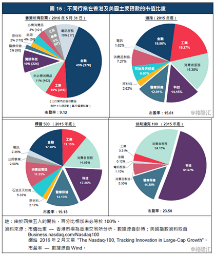 如上文第 2.3 节所分析,若干行业的市盈率或会较高或较低。“传统”金融业的市盈率较低,以高增长潜力吸引投资者的新经济行业如科技及医疗保健等的市盈率则倾向较高。因此,新经济行业比重较高的市场,其加权平均市盈率水平会较高,金融业比重较高的市场,其平均市盈率水平则会较低。在这背景下,科技及医疗保健占约66%的纳斯达克市场是高市盈率市场的例子,而金融股占超过40%的香港市场则为低市盈率市场的例子。(见图15)