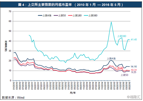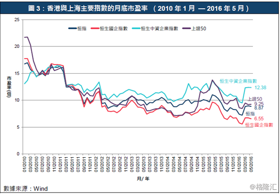 2015 年至2016 年5 月,恒指及恒生国企指数(有9 只H 股同为两个指数的成份股,于恒指的权重为24%)的市盈率均低于上证50 指数,但恒生中资企业指数的市盈率自2011 年起大部分时间均高于上证50 指数。这显示不同的内地股票的股价不但存在跨市场差异,在同一上市市场亦有所不同。