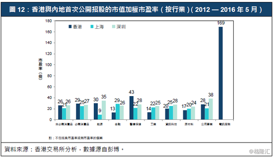 2012 年至2016 年5 月,香港首次公开招股个案按招股价计算的市盈率(市值加权后)平均低于上海及深圳市场(见图11)。不过,如图12 所示,不同行业的首次公开招股有不同的定价差异。整个期间内,在香港进行首次公开招股的定价于以下一些行业中均较上海为高— 非必需消费品、必需消费品、能源、医疗保健及公共事业— 而此中某些行业香港亦较深圳为高。