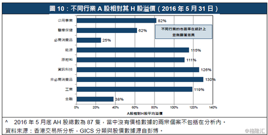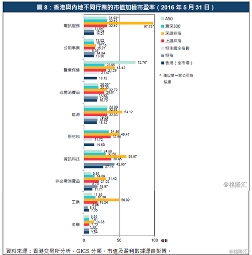 当分析同一市场不同行业个别股票(于2016 年5 月31 日)的市盈率差异时,香港与内地市场