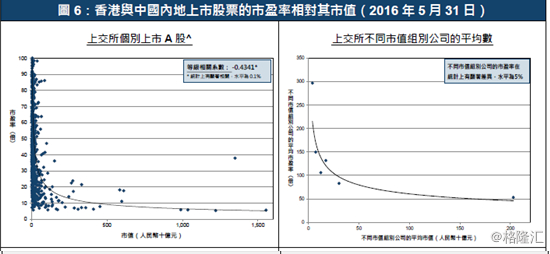 在中国内地,现代化股票市场的时日尚浅,散户投资者还不是太成熟及老练。内地市场投资者进行的交易多属炒卖。这些投资者对细价及高风险股票有偏好,爱其潜在收益较高。因此,在内地市场,公司规模愈小,市盈率愈高。香港股票市场是高度国际化的市场,在其过去百年的历史中多次经历狂升暴跌,即使是散户投资者也相对成熟。在这样深邃的投资者结构下,公司规模在香港市场并非股价的决定性因素。(见上文第2.1 节)