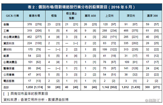 为研究不同行业股票的市盈率,我们根据全球行业分类标准(GICS)4将香港与内地市场上市股票分为10 个行业。下表2 显示所研究股票于个别市场或指数环节按行业分布的数目。