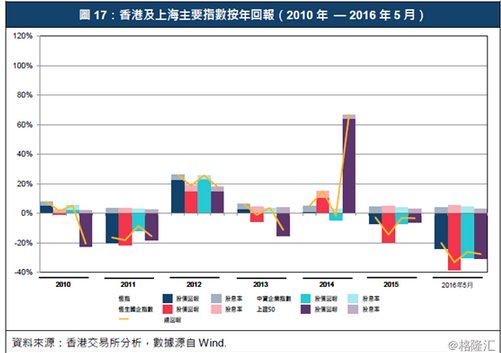 恒生中国企业指数(恒生国企指数) — 成份股40 只,2016 年5 月占主板所有H 股市值81%及成交额30%;