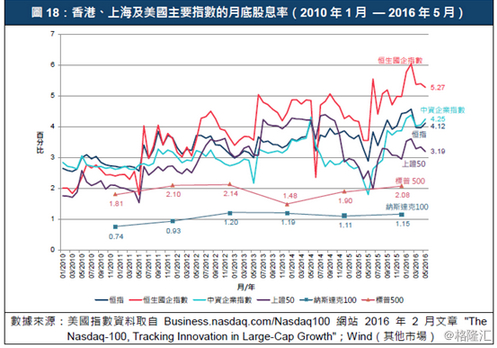 事实上,如图18 所示,过去五、六年间的大部分时候,上证50 指数的股息率均较恒指低,而自2011 年起,恒生国企指数的股息率大部分时候均高于其他香港指数及上证50的股息率。相较之下,纳斯达克100 的市盈率虽相对较高,其股息率却是最低。上交所及深交所不同指数的股息率亦显示指数的市盈率较高,其股息率会较低,相反亦然(见下图19 及上图4 及5)。原因可能与成份股的性质有关— 如属业务及收入稳定的传统行业,派息会较高,但增长前景偏低,市盈率因而亦较低;如属高增长的新兴公司,市盈率会较高,但因收入不稳定甚或尚无盈利,其派息会偏低甚或不派息。