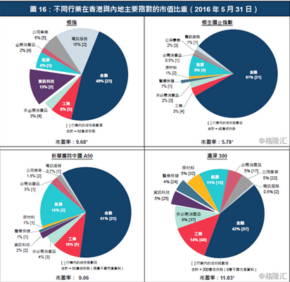 在香港,不同指数的市盈率亦有差异― 恒生国企指数的市盈率较恒指低(见上文第2.1节)。原因之一是恒生国企指数的低市盈率金融股的市值占比高,达81%(恒指为48%)。