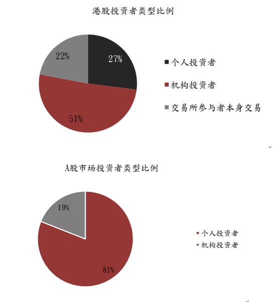 港股市场投资者构成: 港股市场中,机构投资者数量占51%,个人投资者占27%,交易所参与者自营占22%。