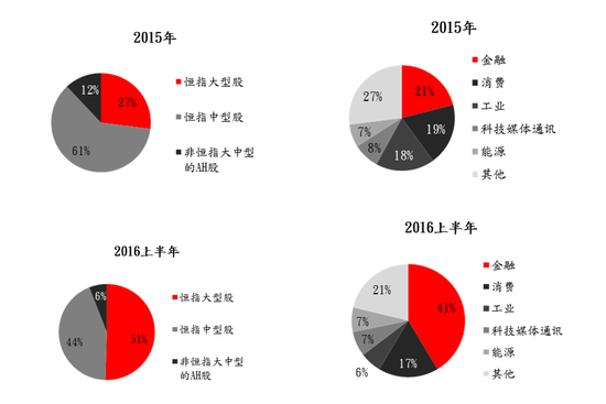 港股通标的中,市值占比最高的行业为:银行、房地产、TMT、金融以及能源。港股通交易风格也比较偏重蓝筹股、高派息股以及金融类股票。其中,金融股成交额在2016年占总成交额的41%,远高于2015年的21%。而工业股占总体的成交额已经从2015年的18%下滑至6%。