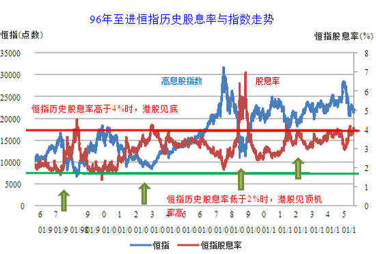 其次,我们从“96 年至进恒指历史股息率与指数走势图” (图二)上发现,自 1996 年至今,每当恒指股息率到 4%时恒指见底几率高;当恒指股息率跌至 2%时恒指 见顶的几率高。目前恒指股息率在 4%左右,所以相对做多恒指的胜算较大。