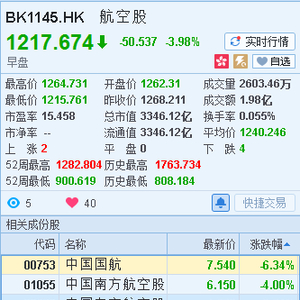 油价上涨航空股下挫 中国国航跌6%