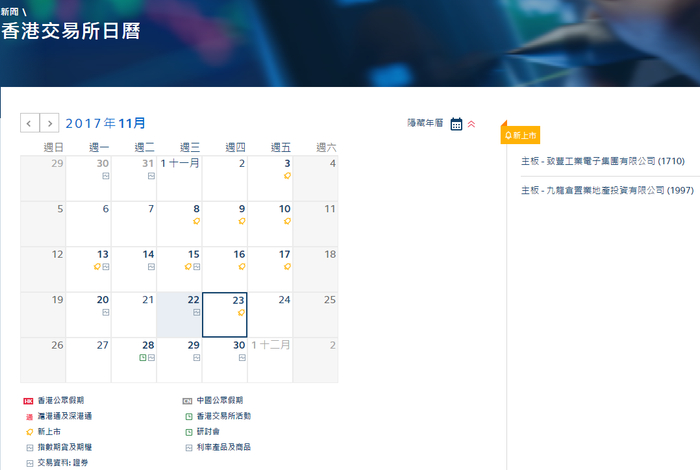 最后当然是新股的上市日期了,新股从这一天起可正式进行交易,在港交所新闻栏目的日历中可以找到近期新股的上市时间: