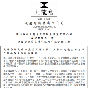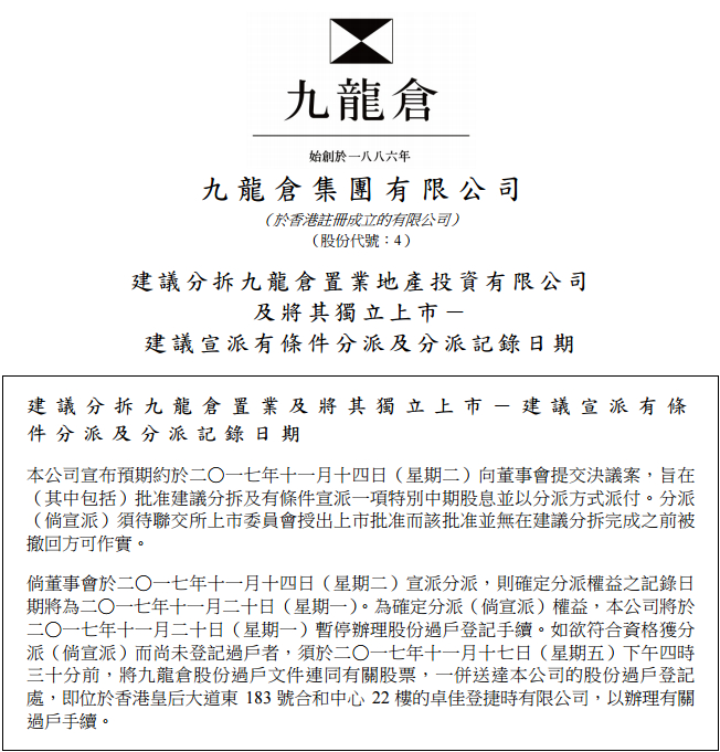 上周四(11月16日)正好是九龙仓(00004)分拆九仓置业(01997)上市的除净日,公司首先在11月2日发布公告通知投资者派息的具体日期: