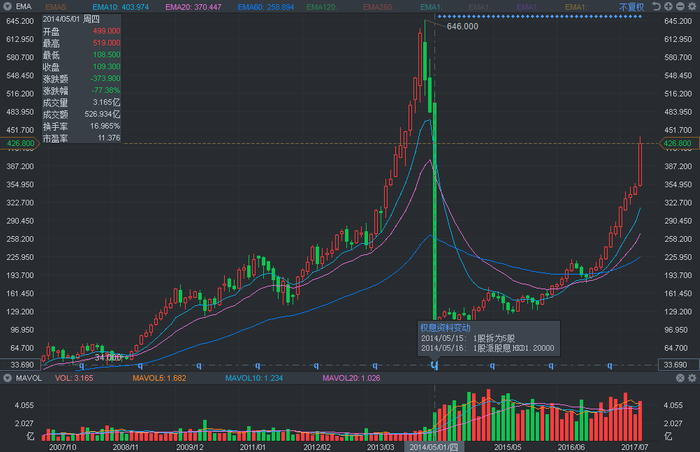 例如腾讯(00700)就曾在2014年股价超过600港元时进行过一次“一拆五”,否则目前的股价恐怕已经超过2000港元,下图以不复权的方式直观地体现出拆股对股价的影响,但此后腾讯股价依旧一路飙升:
