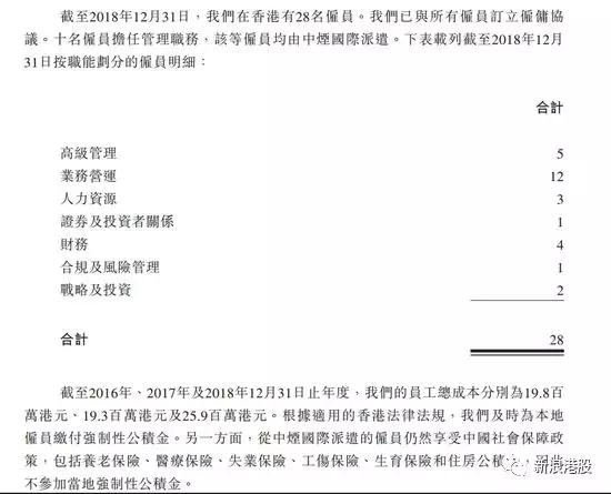 而就烟草香港来说,也有比较有意思的点,招股书显示,截至2018年底,中烟香港在香港仅有28名雇员,2018年,中烟香港收入约为70.33亿港元,意味着人均年创收逾2.5亿港元。员工总成本共计约2591.4万元港元,粗略估计中烟香港的雇员均薪高达92.55万港元,折合82万元人民币,比港股股王腾讯员工的年薪还高。2018年,腾讯薪酬成本共计421.53亿元,以公司2018年底54309员工计算,腾讯员工平均年薪为77.6万元。