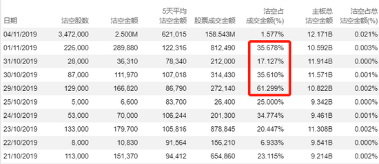 西藏水资源暴跌之前,沽空率居高不下,10月29日沽空比率更是高达61%,11月1日沽空率为36%,而11月4日公司沽空股数高达347万股,股价暴跌之后沽空率骤降至1.6%。