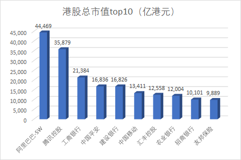 据choice数据,以总市值计算,港股市值前10名入围已经逼近1万亿港元的体量。其中,阿里巴巴市值最大,为44469亿港元;腾讯控股第二,为35879亿港元;工商银行总市值21384亿港元,位列第三;中国平安市值16836亿港元,位列第四;建设银行第五,市值16826亿港元。中国移动、农业银行、汇丰控股、招商银行、友邦保险分别位列6-10名。