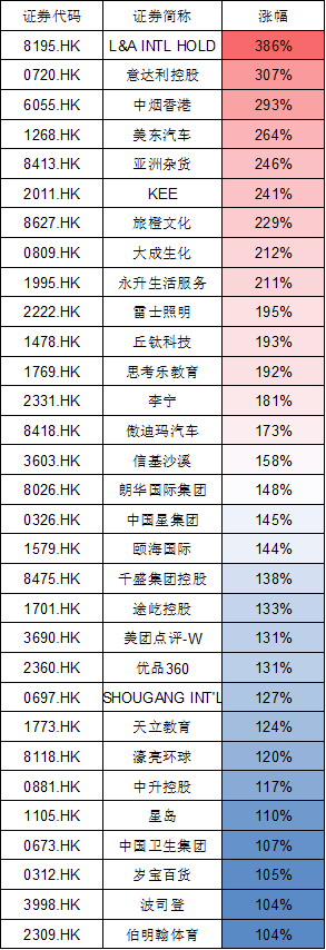 消费股涨幅居前。李宁涨181%,颐海国际涨144%,美团点评涨131%。波司登涨104%打脸沽空机构,沽空机构Bonitas指责波司登虚增8亿利润,股价一文不值。